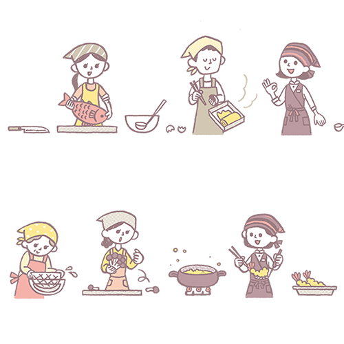 月刊ベターホーム もくじ絵「フライパンちゃんとお鍋くん」